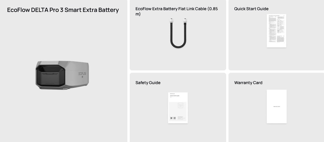I esken finner man EcoFlow Delta Pro 3 Smart Ekstra batteri, Hurtigstartveiledning, Sikkerhetsveiledning, Garantikort, EcoFlow ekstra batterikabel