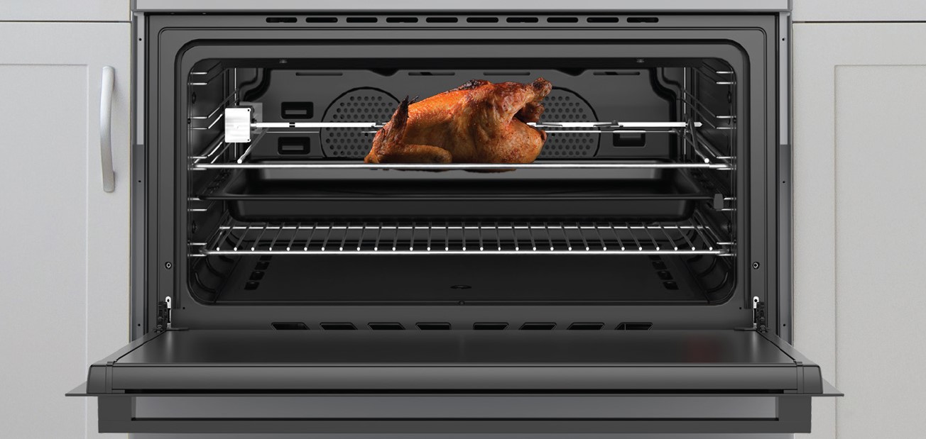 For ekstra sprø og saftig grilling av kylling eller andre større kjøttstykker, har ovnen Rotisseri funksjon, eller på godt norsk, et roterende grillspyd, slik at kyllingen kan rotere rundt for enda bedre grilling.